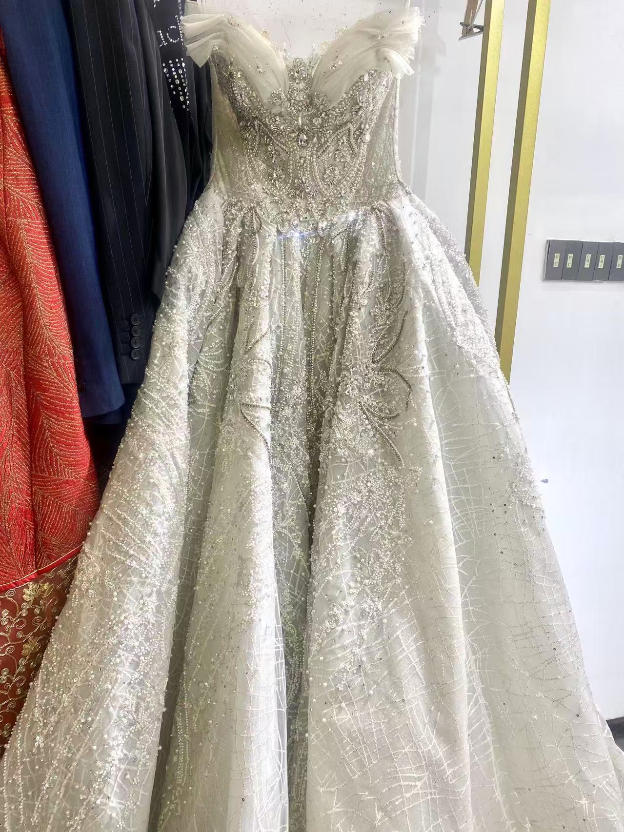 一字肩泡泡袖金色钉珠手工贴花亮片拖尾婚纱
