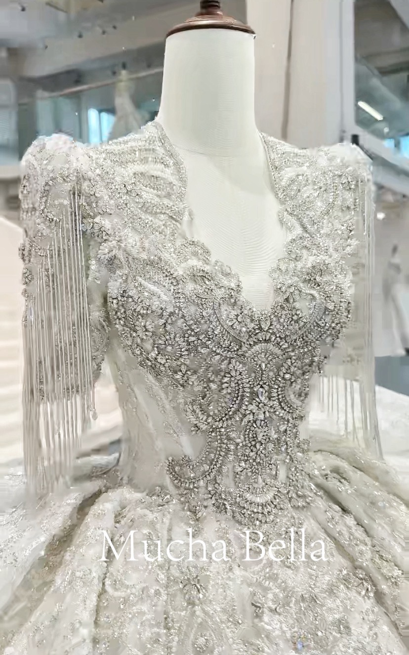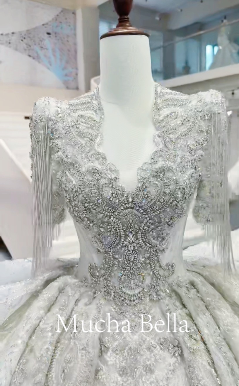 首页 / 婚纱 / Mucha Bella / V领半袖流苏重工大拖尾仪式纱