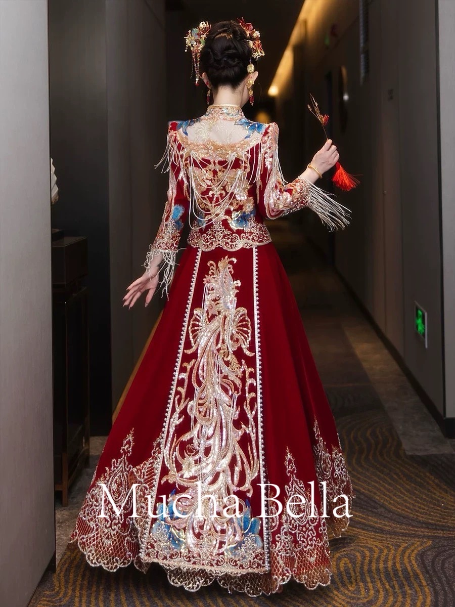 首页 / 中式 / Mucha Bella / 酒红色丝绒重工钉珠秀禾