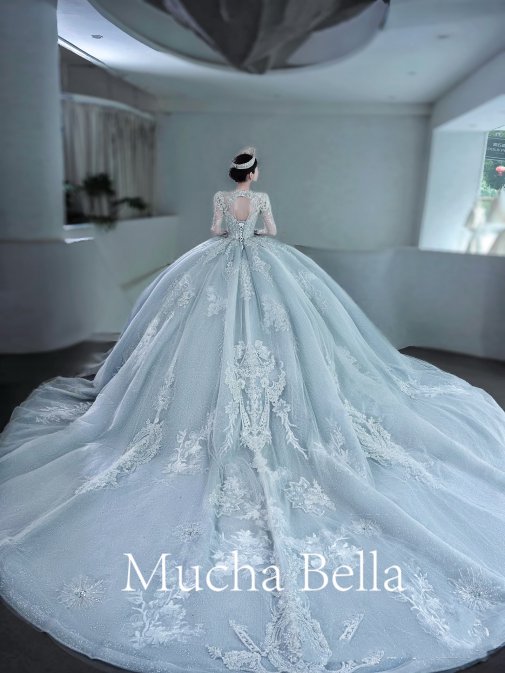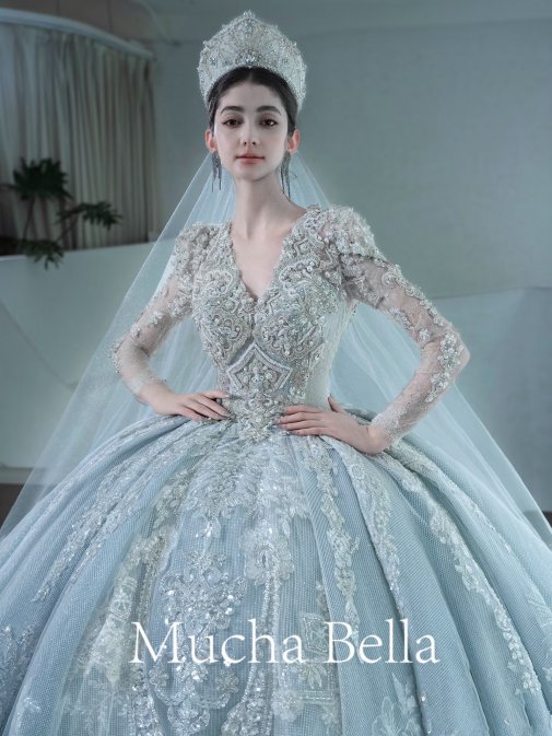 首页 / 婚纱 / Mucha Bella / 蓝色V领长袖重工仪式纱