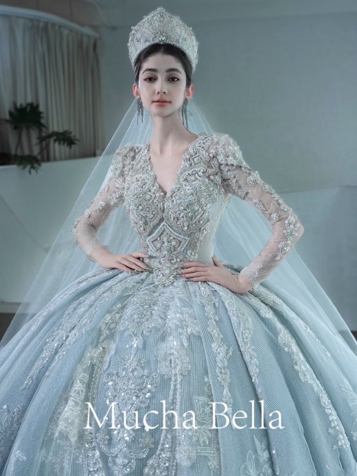 V领长袖星空闪钻纱蓬裙大拖尾婚纱