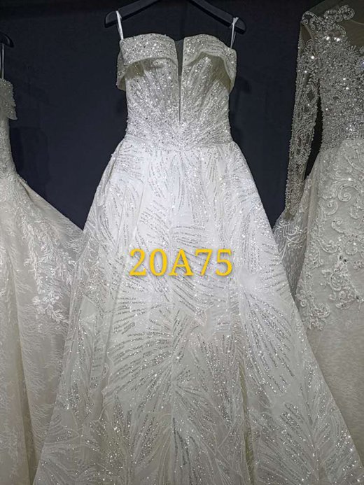 一字肩镭射亮片拖尾婚纱