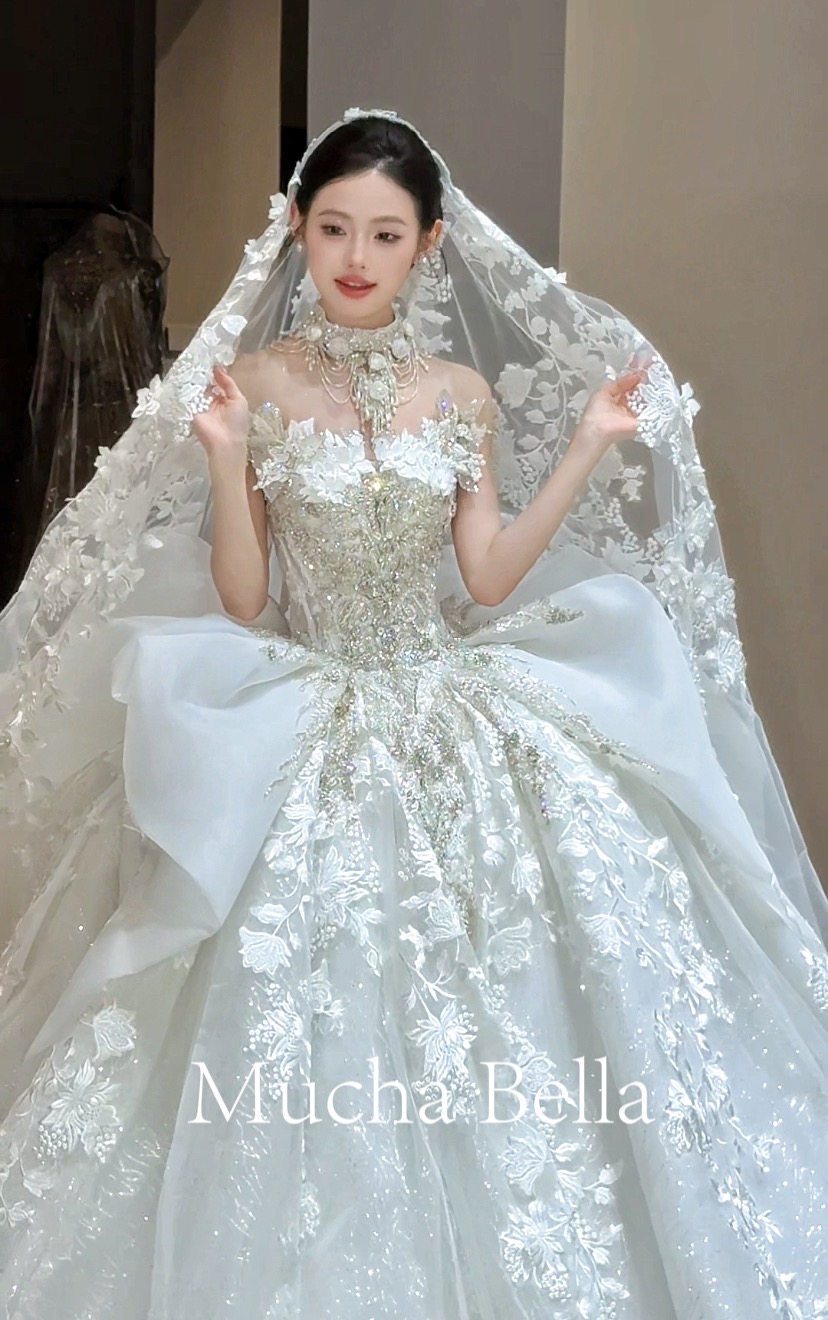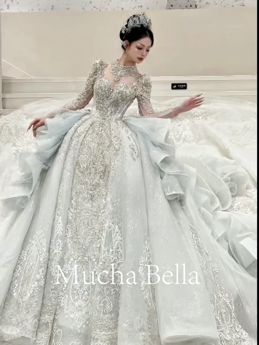 长袖重工钉珠抓褶设计大裙摆仪式主纱