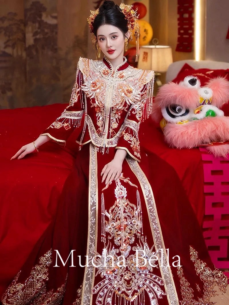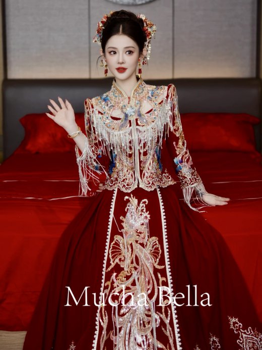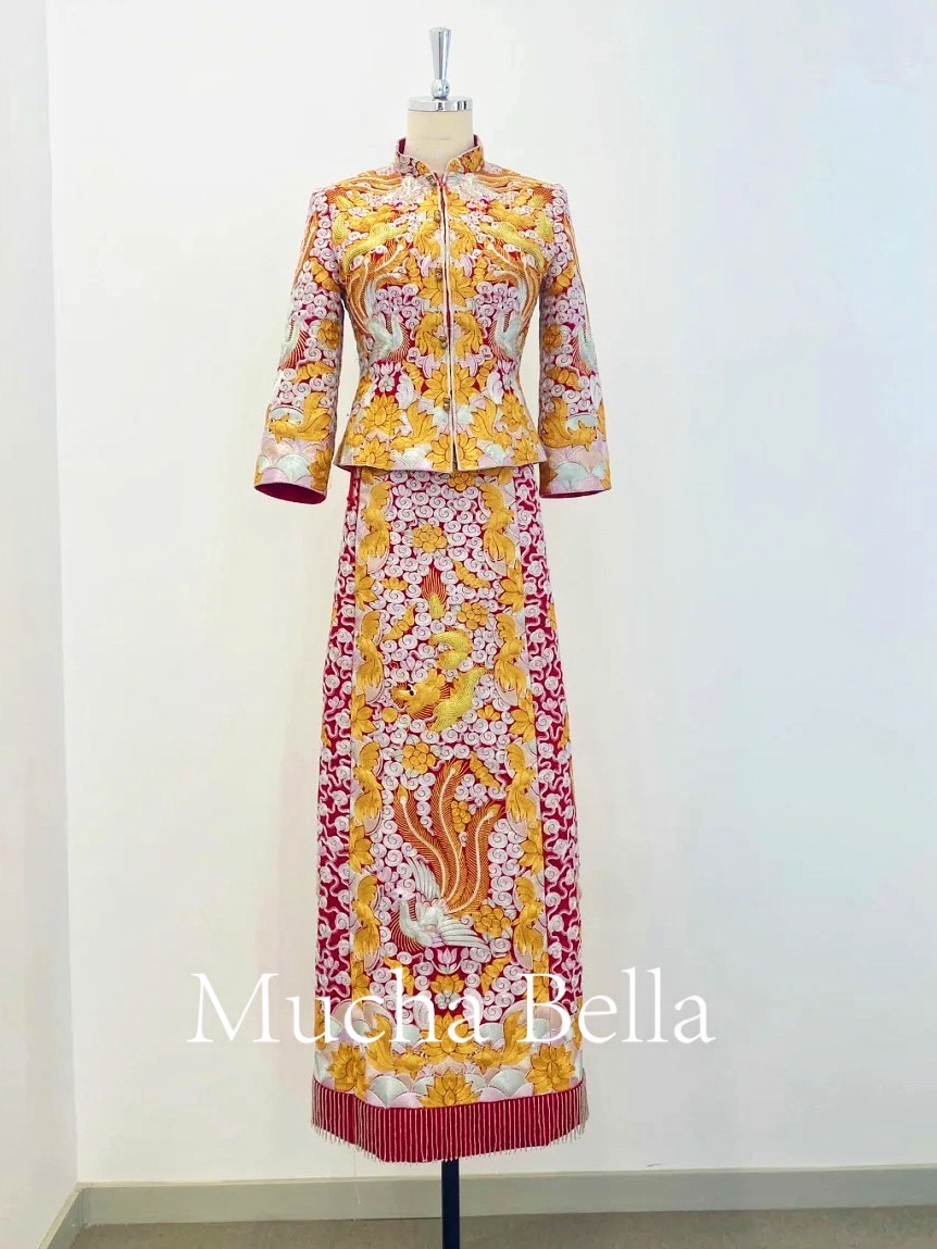 凤凰于飞红色醋酸缎手绣改良版小拖尾秀禾